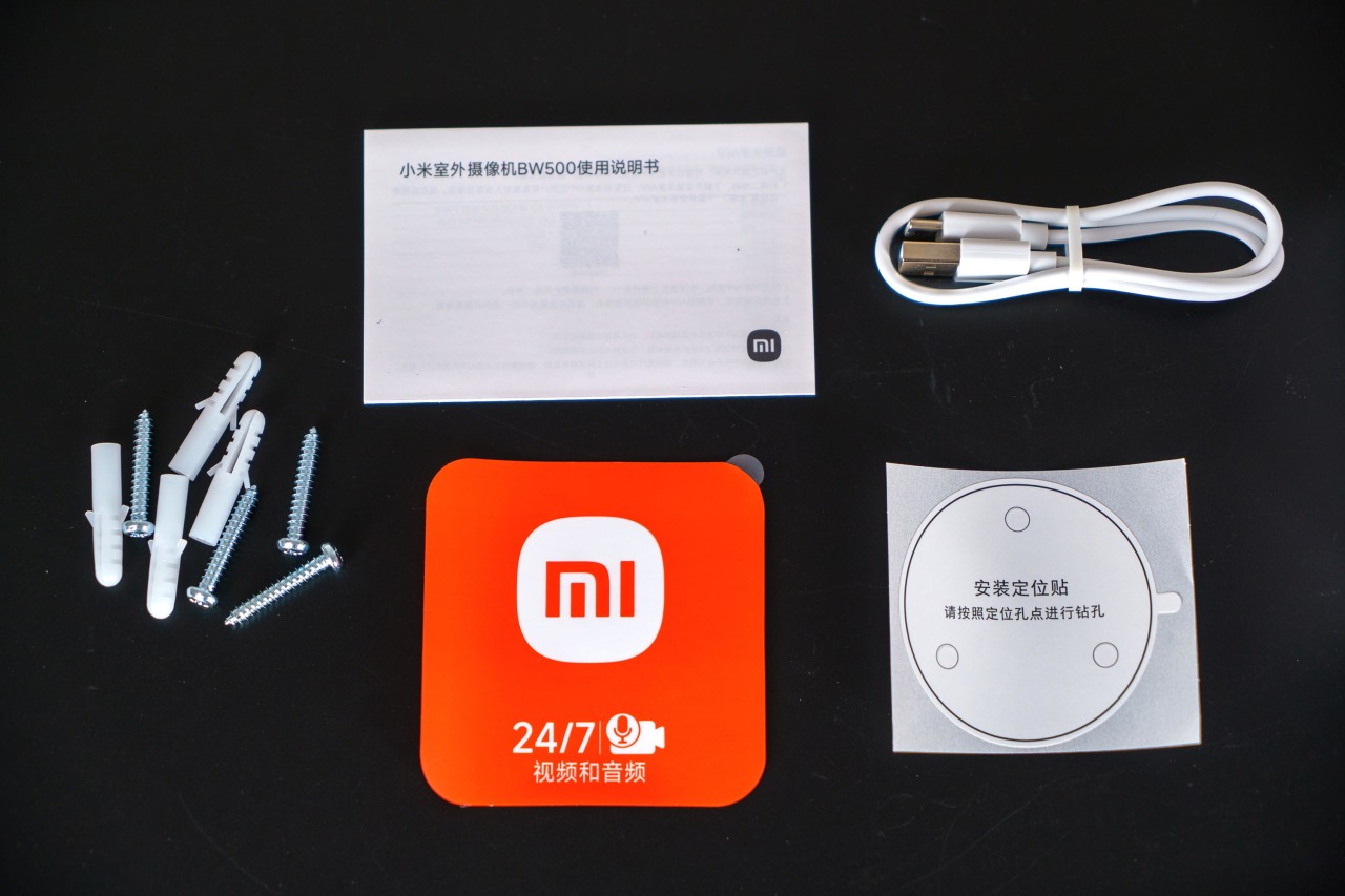 ▼除了BW500本体之外,有一包安装螺丝配件包、一本使用说明书、一张监控点位警示标签、一张安装定位贴纸、一根充电线和一根安装支架