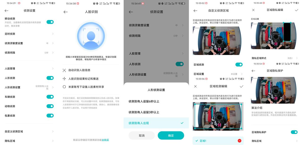 ▼侦测设置里可以调节侦测的灵敏度和间隔等参数,人脸管理功能是在云端执行的,购买了云存储后才能使用;人形侦测可以在识别到有人出现后立马做出反应或在人物逗留3秒或6秒后再做出反应,不过这个时间选项太少了,后续固件更新可以多增加一些时间选择;用户也可以自定义侦测的范围,一定程度上可以增加识别区域的识别率,对设定范围外的画面变化不会做出反应