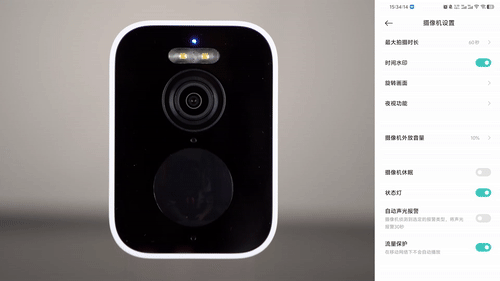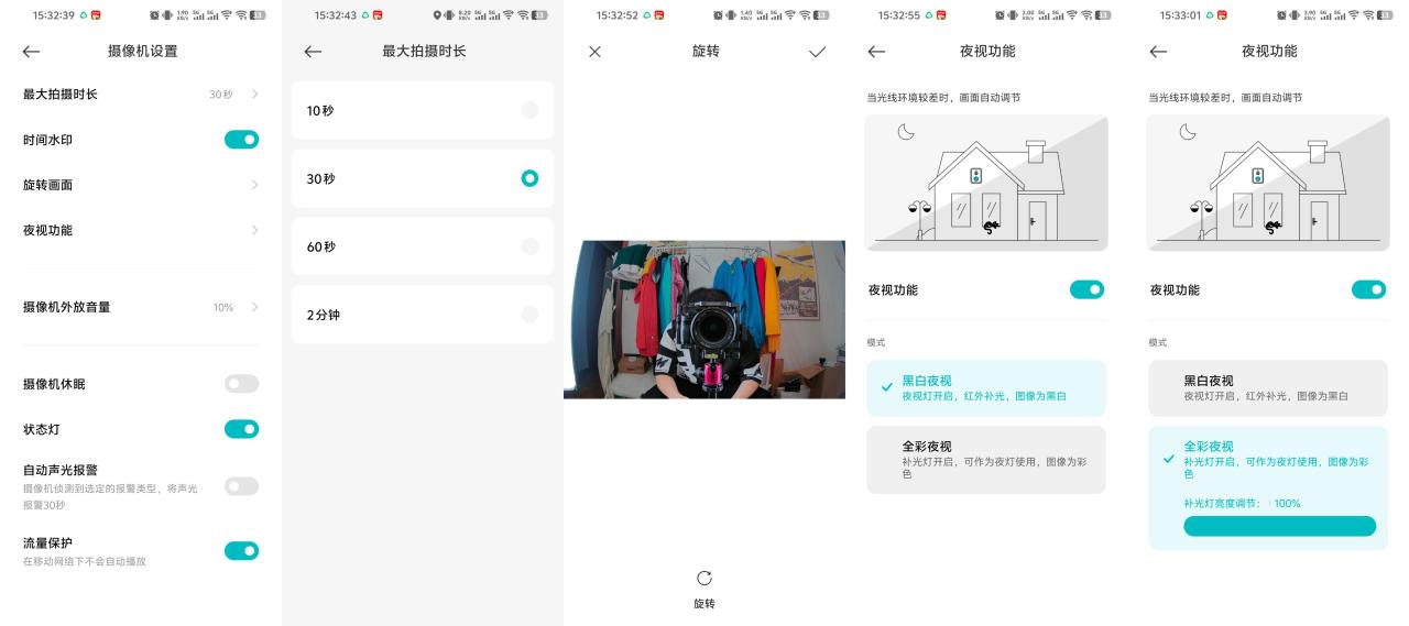 ▼挑几个常用的功能介绍一下。首先是摄像机设置,它支持设定单个视频文件的时长,最大可以设置到2分钟;画面旋转也是一款监控设备必备的功能,用来纠正不同安装方向下的画面;夜视版功能可以手动开启和关闭,也可以选择打开关闭白光灯,白光灯的亮度还可以进行调节,只不过不是无级调节的