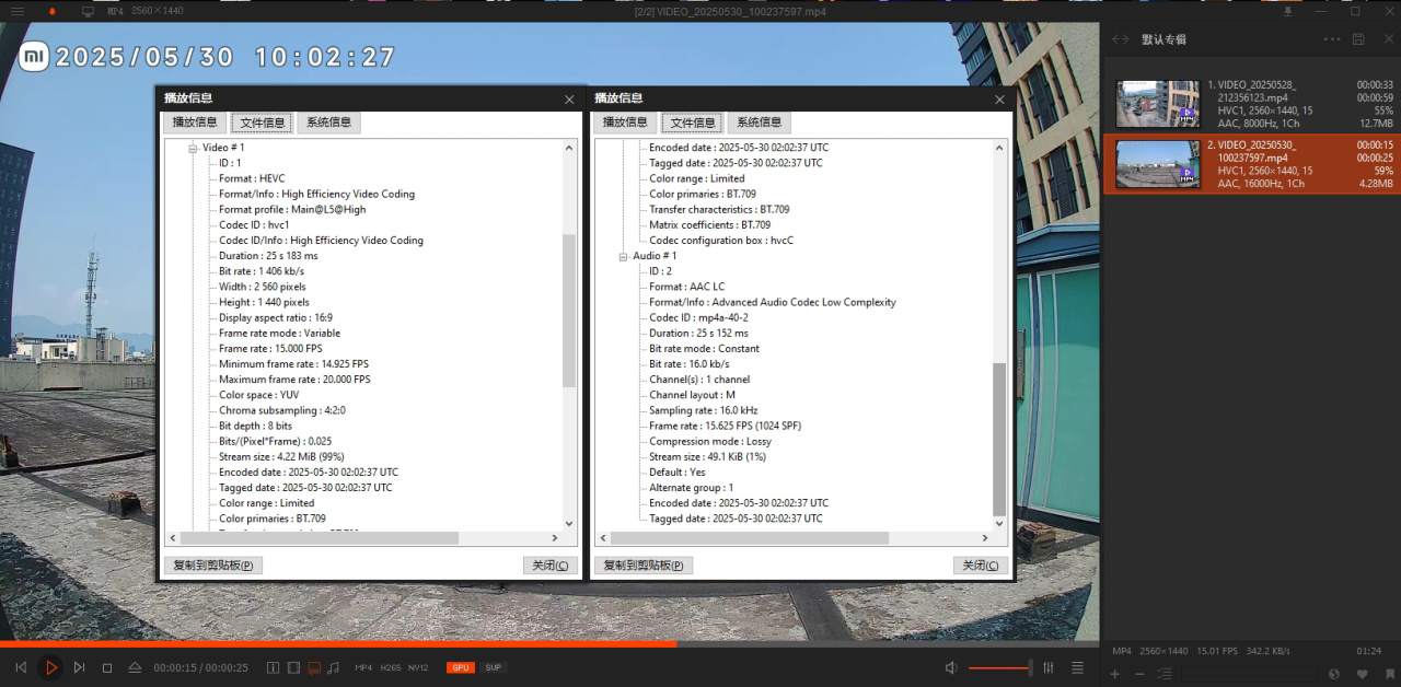 ▼根据录制下来的文件可以看到,这款小米室外摄像机BW500的基本录制规格如下:视频录制编码为HEVC,也就是H.265编码,最大录制分辨率为2560*1440,最大录制帧率为15帧,码流1.3Mbps左右(因为是H.265所以码率比较低)音频录制为AAC LC编码,单声道,16kHz采样率;除了视频帧率有点低,音频录制稍微有点拉,但是已经比很多8kHz的供电监控要好许多了,总体也还算符合这个价位的家用监控;因为用的是H.265编码,所以视频文件的大小可以做到1分钟大概是12M,32G的内置存储可以录制大约45小时的内容,相当于常电监控完整的2天视频素材,所以对电池监控来说是完全够用的,因为一天24小时不可能24小时都是事件录制