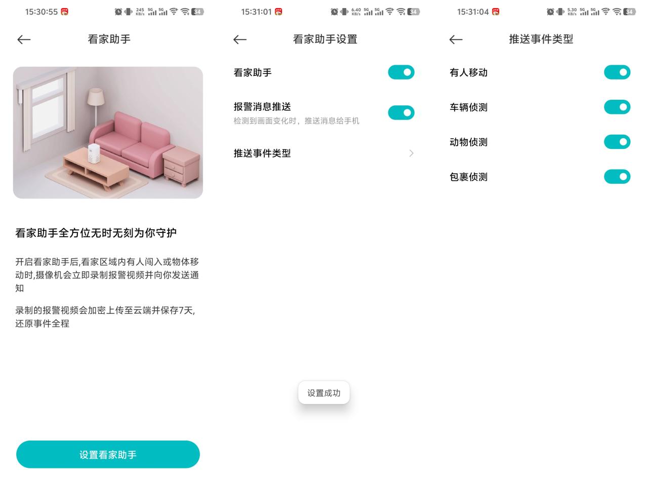 ▼再往下是看家助手入口,打开这个功能后,可以实现在相关事件发生后,自动推送消息到你的手机上,它支持检测的内容有:人、车、动物、包裹,并且这些检测算法都是在本地执行的,拥有1.2T的算力,能做到毫秒级的判断,所以识别效率会更高,识别更及时