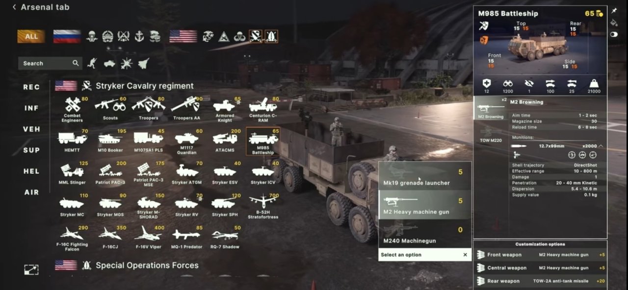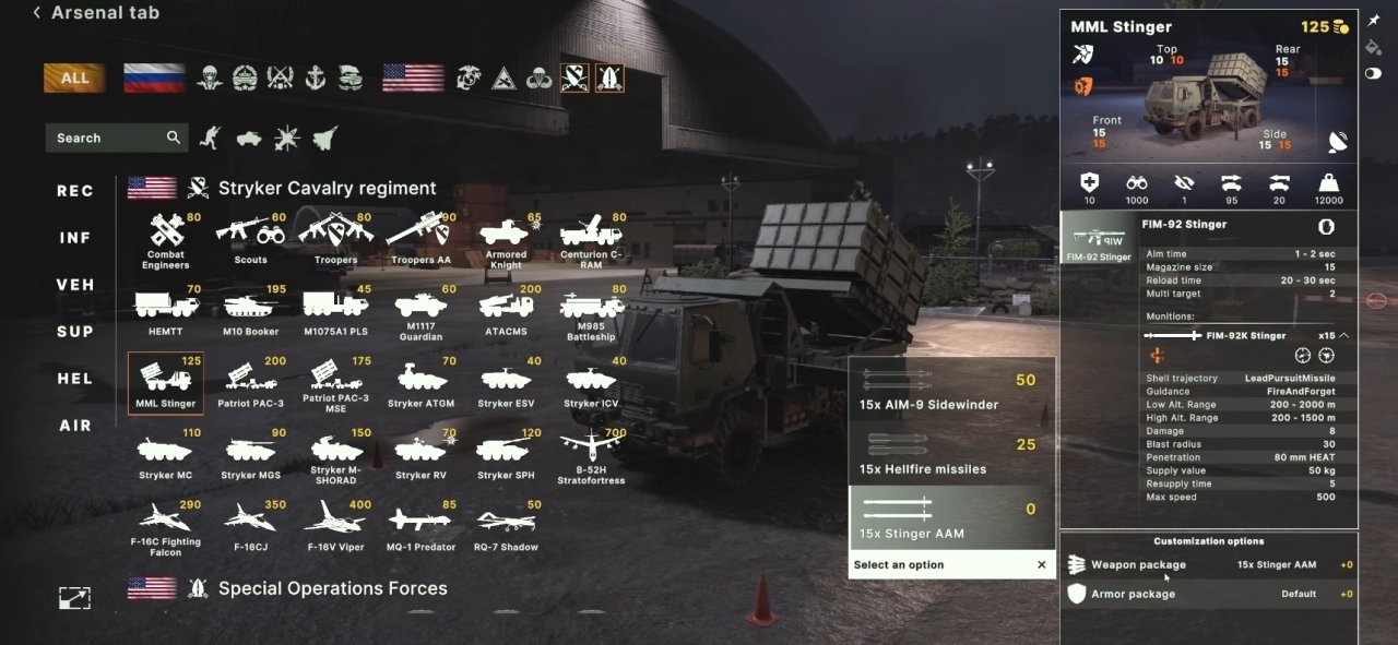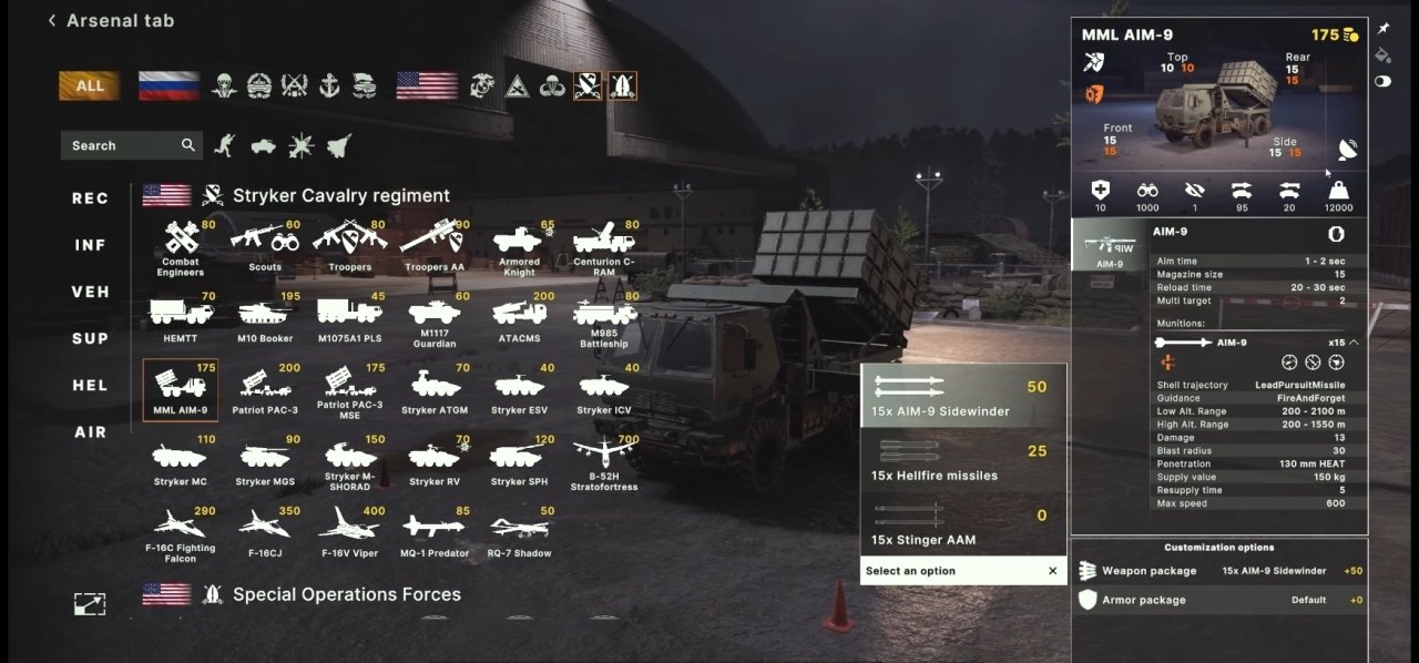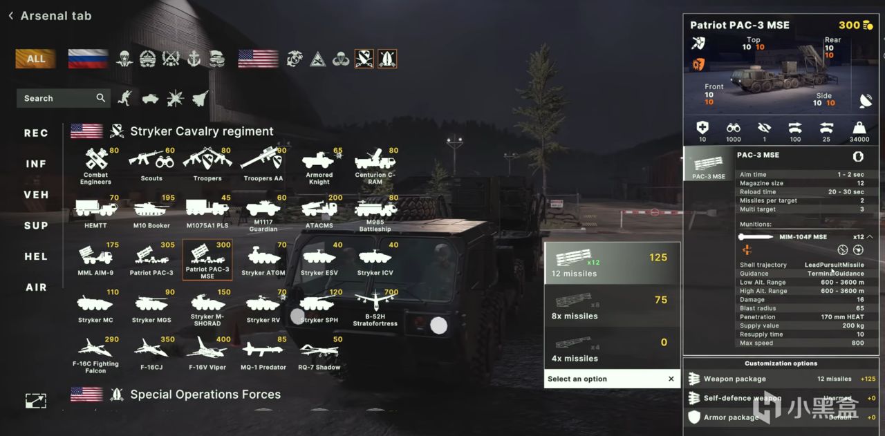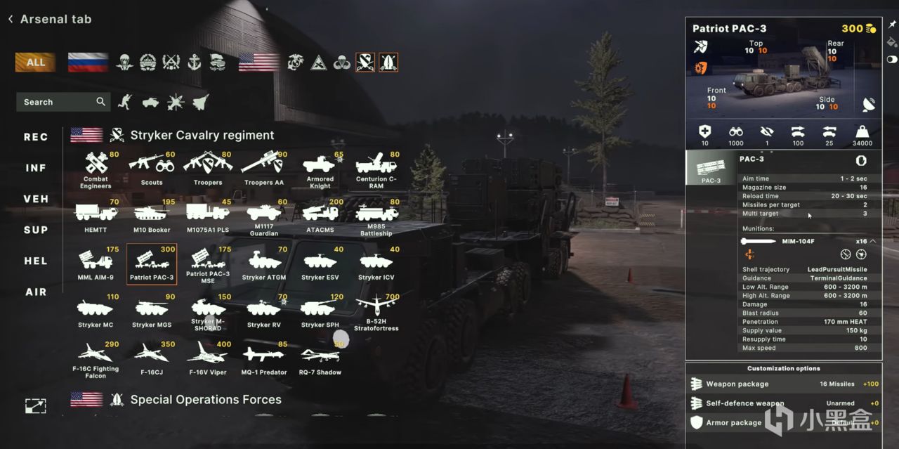 愛國者3防空導彈,相比愛國者2射程由4000m降低至3200m,裸車由2發增加至8發 。可加100分加裝至16發,同時可鎖定3個目標,向每個目標發射2枚導彈,可配置自衛武器以及加裝防禦