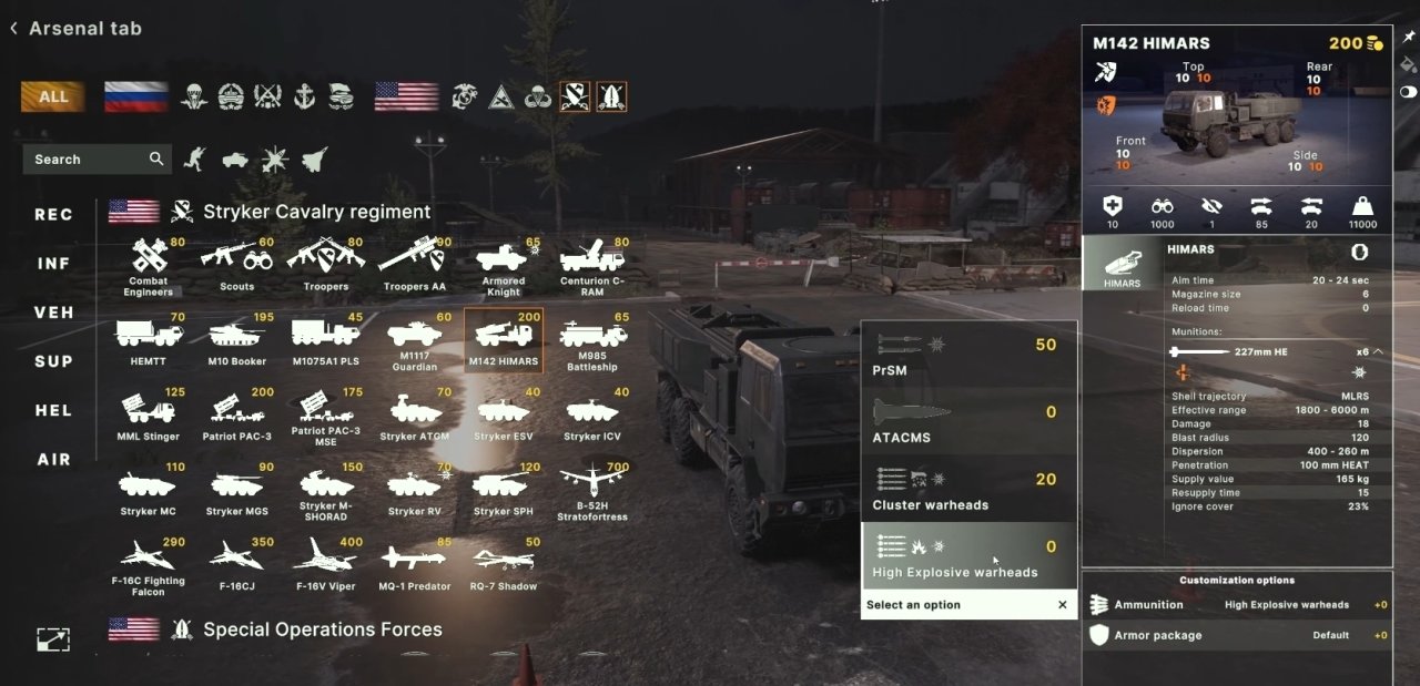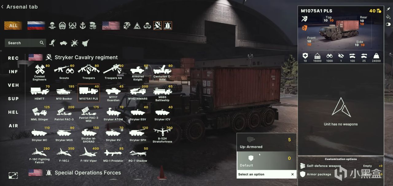 總結,史崔克專精中的載具幾乎都不具備抗線能力的,在全員輕裝甲的配置下不斷的穿插滲透快速進攻纔是比較好的選擇,抗線可以交給鄰近的隊友處理。同時防空能力優秀,不論是高低配合或是應對反輻射的方法都在平均水平之上,同時大量具備反導能力的單位可以很好的保護己方部隊。(甚至可以保持廉價防空雷達時刻開機騙完對方的反輻射彈後再讓重防從容開機)