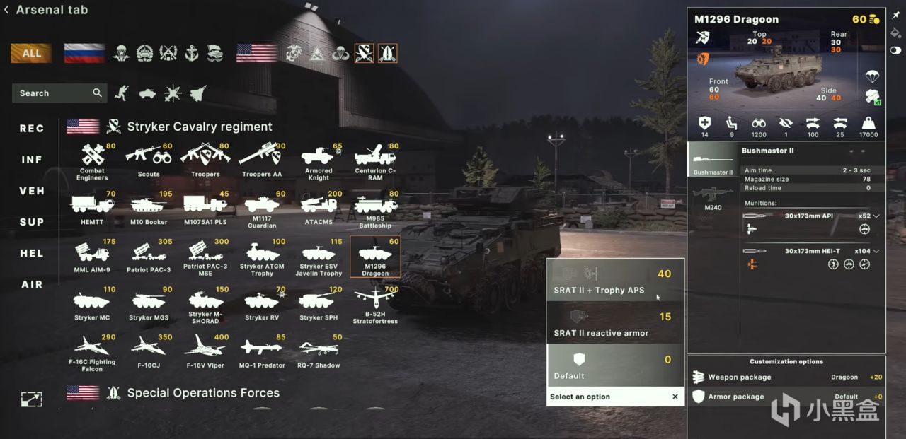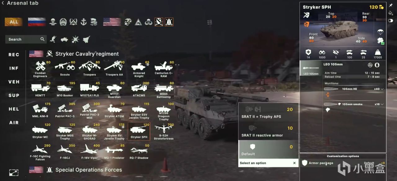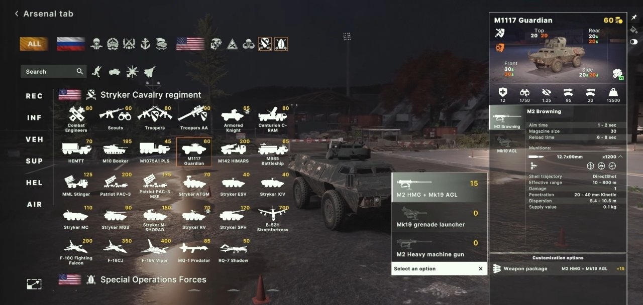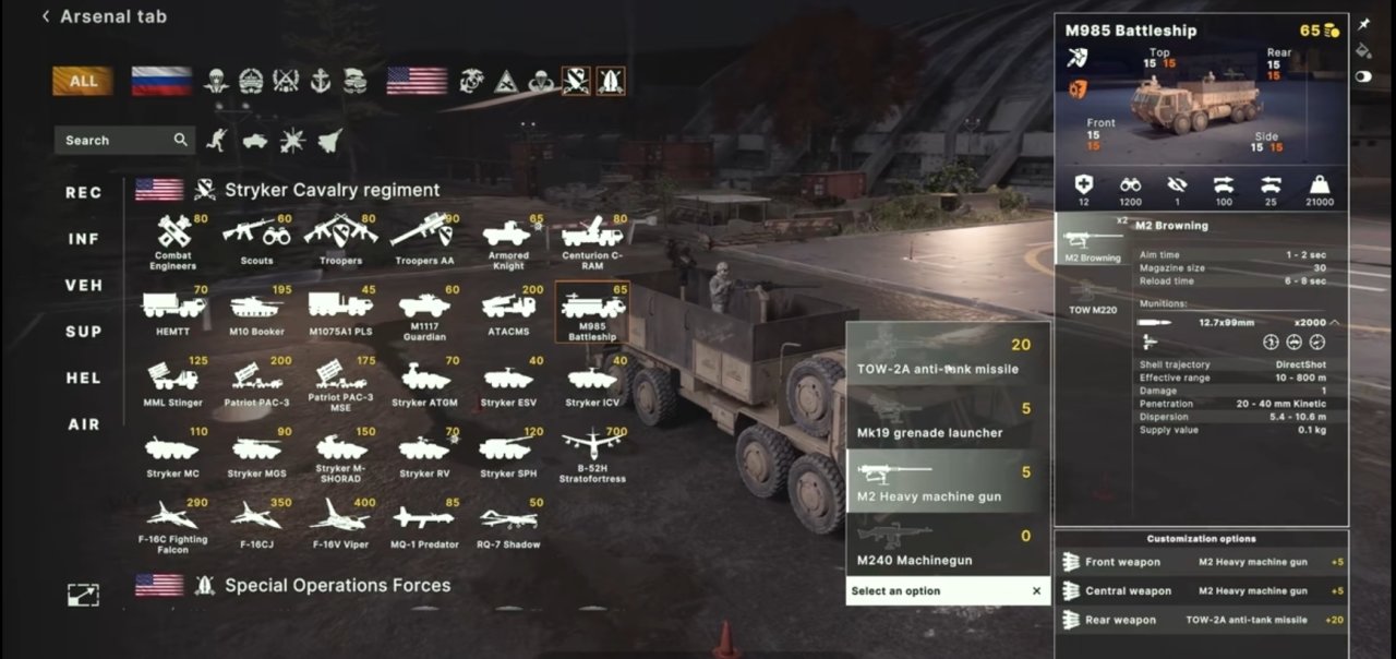 即使加裝了裝甲以及主動防禦系統,史崔克依舊是一輛脆皮車,沒有辦法與敵方坦克正面交火,更適合用來清理輕型載具或利用機動打伏擊。(用垃圾海硬換分也不是不行,前提是你的隊友足夠靠譜)