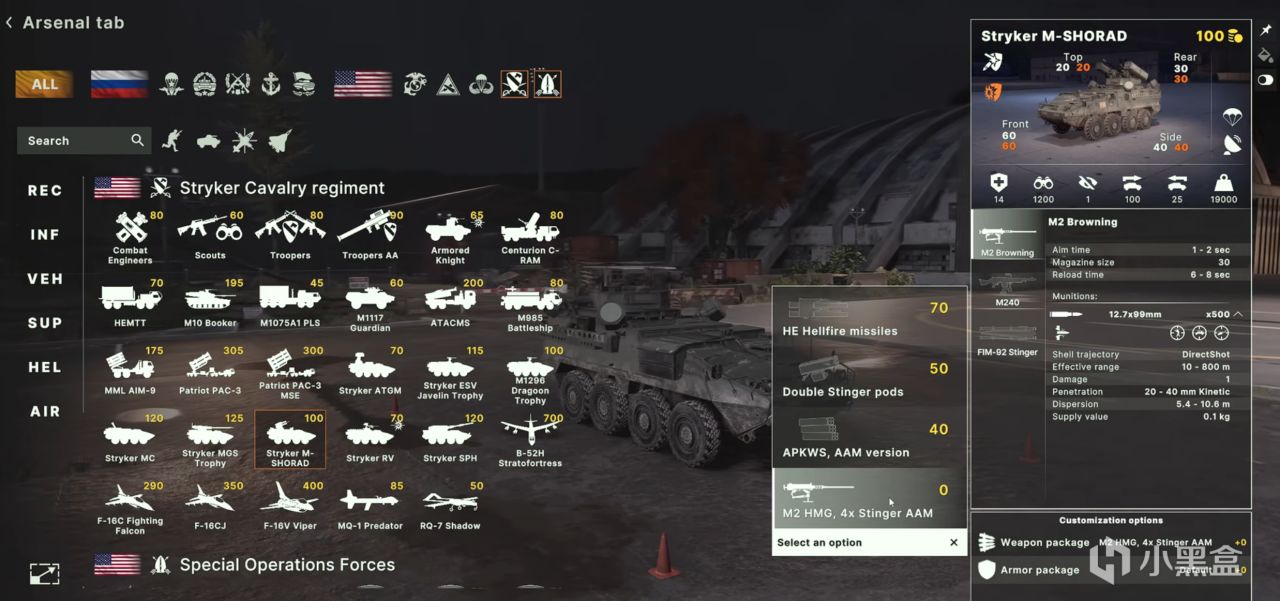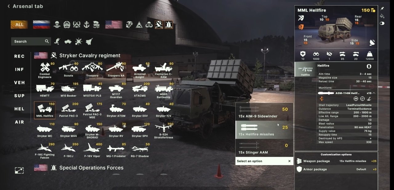 是很全能的aa車,而且備彈充足,可以搭配愛國者高低搭配,或者在愛國者補給或轉移陣地時填補防空漏洞,或者直接攜帶15枚地獄火搭配雷達增益壓制敵方裝甲,不過需要注意的是其對高空目標缺乏應對手段。