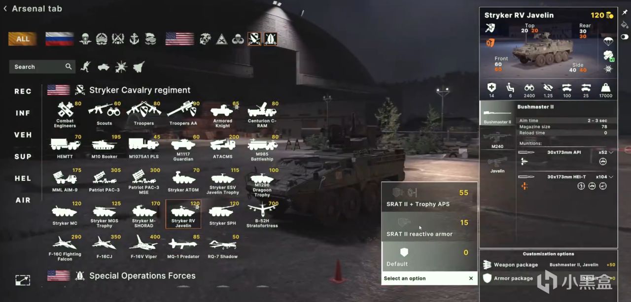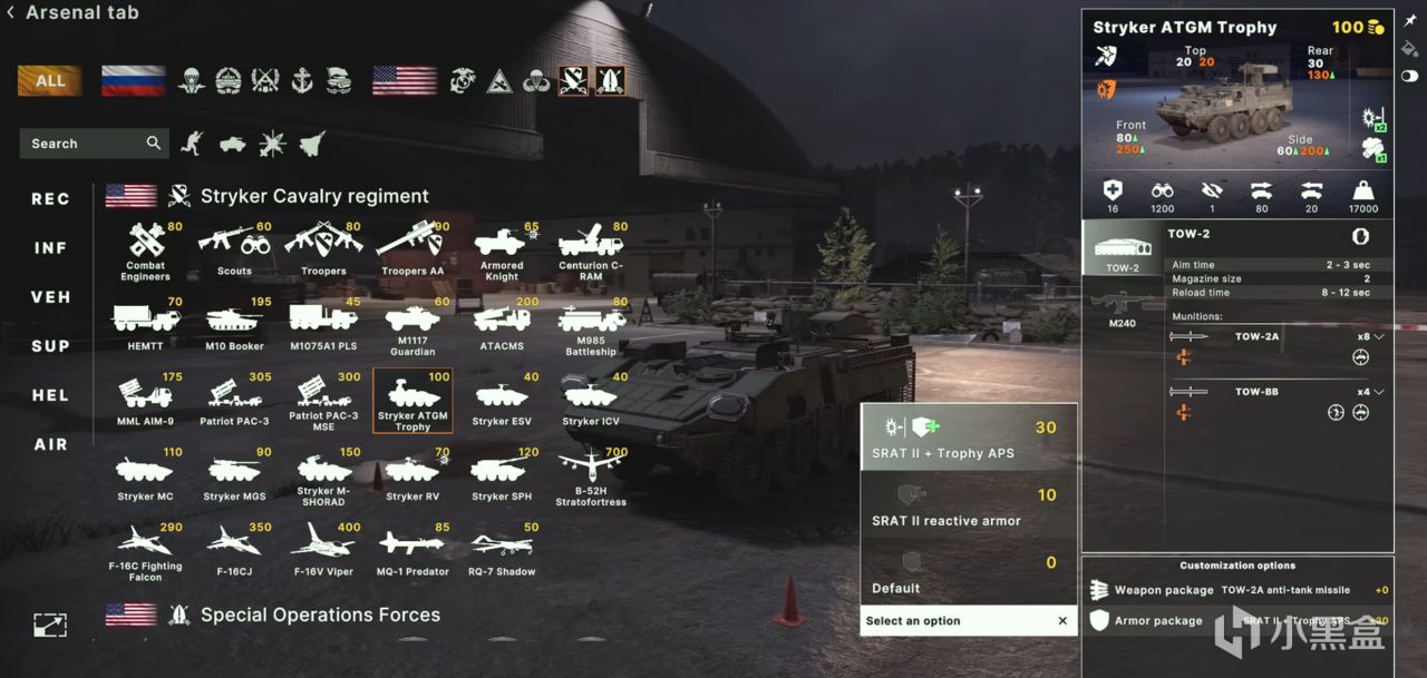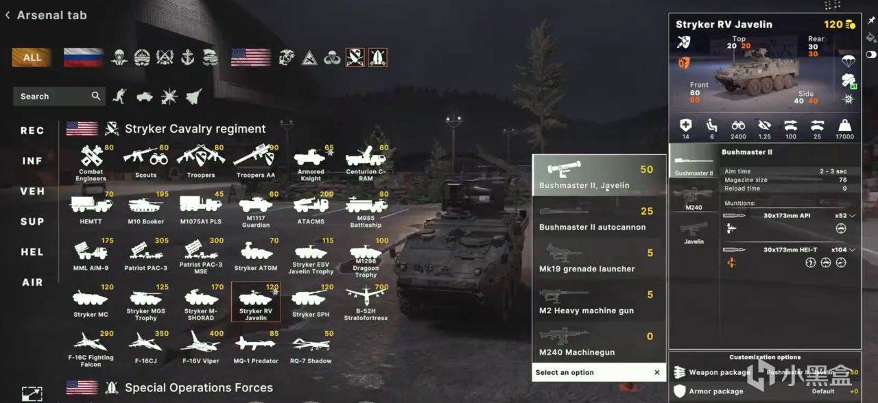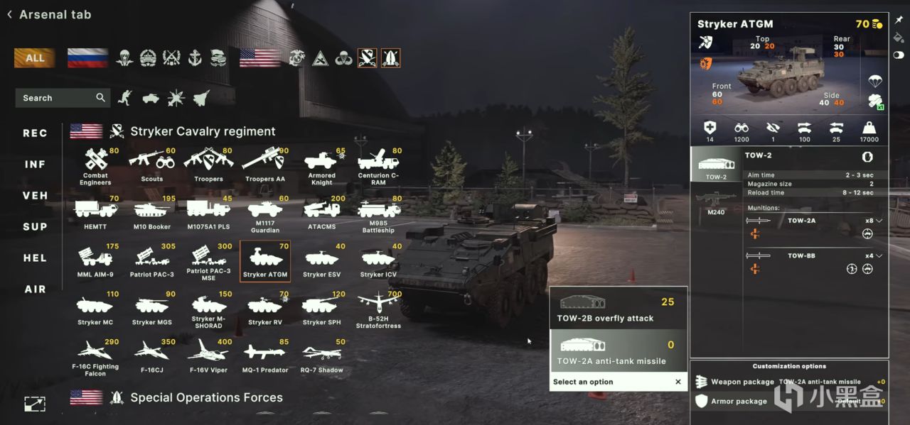 史崔克車族的AT型,裸車攜帶8發TOW-2A以及4發TOW-BB(高爆陶),可加25分將2A換爲2B(由直擊改爲攻頂),可加裝額外裝甲以及“戰利品”主動防禦系統。