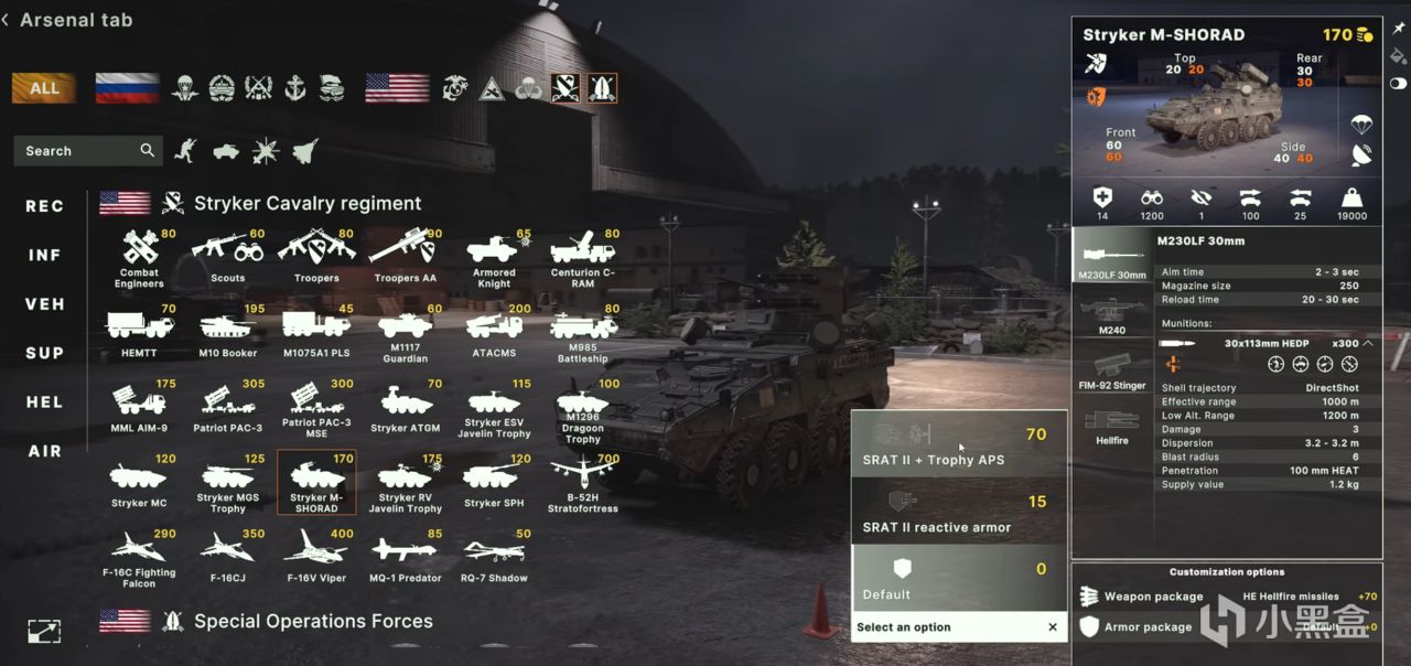 史崔克的防空版本,默認爲一挺.50機槍加上4具毒刺,比較有趣的配置是1門30mm機炮加上2具毒刺吊艙(1具吊艙4發,共有備彈16發),這門30mm機炮可承擔反導任務,可加裝額外裝甲以及“戰利品”主動防禦系統。