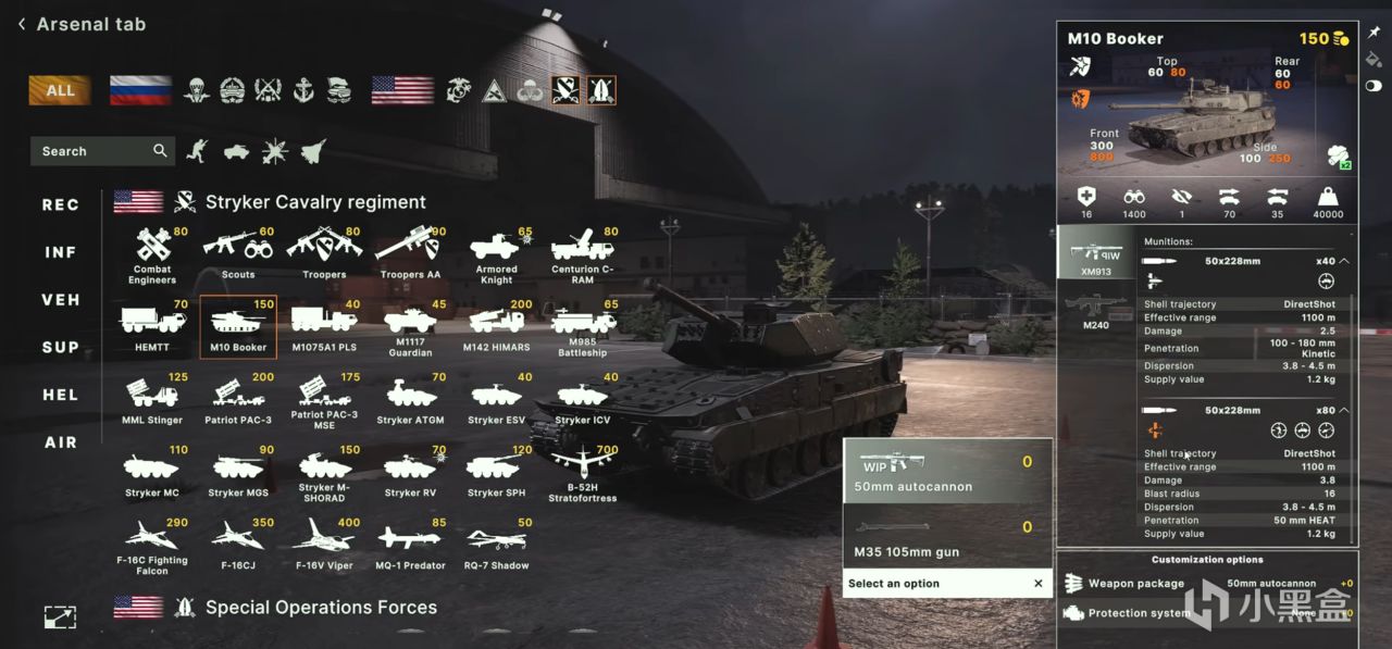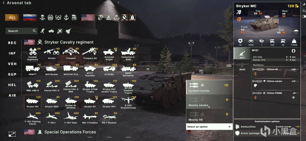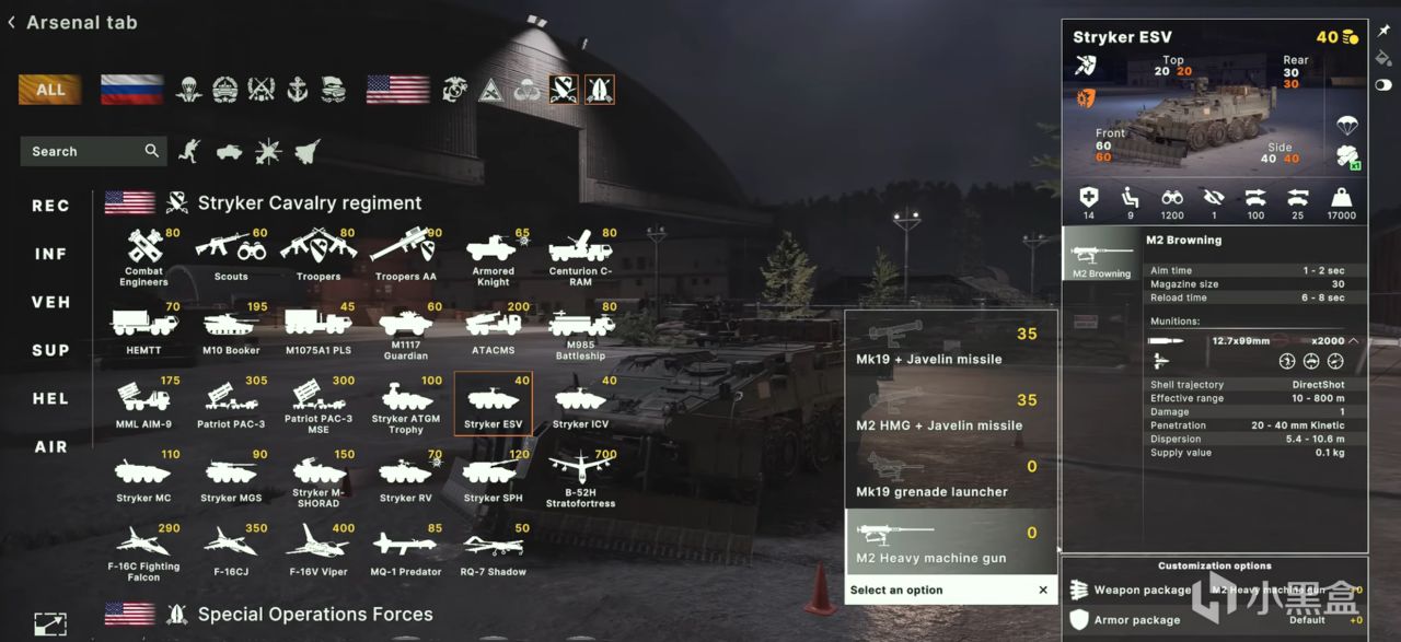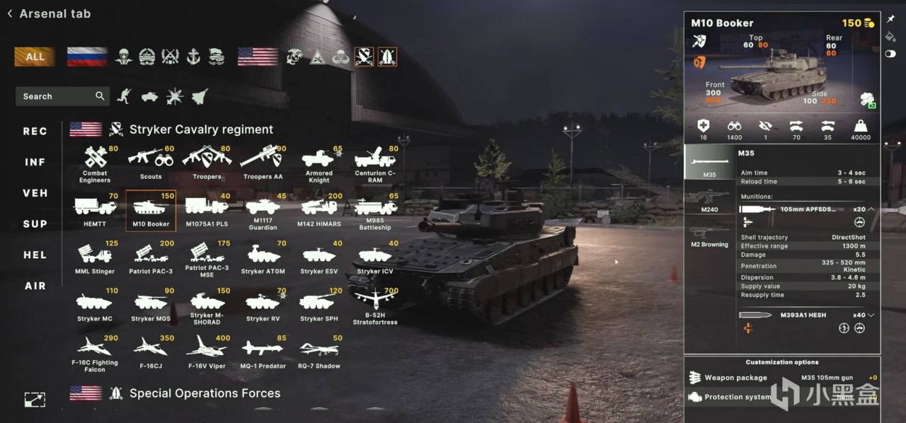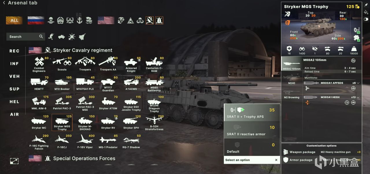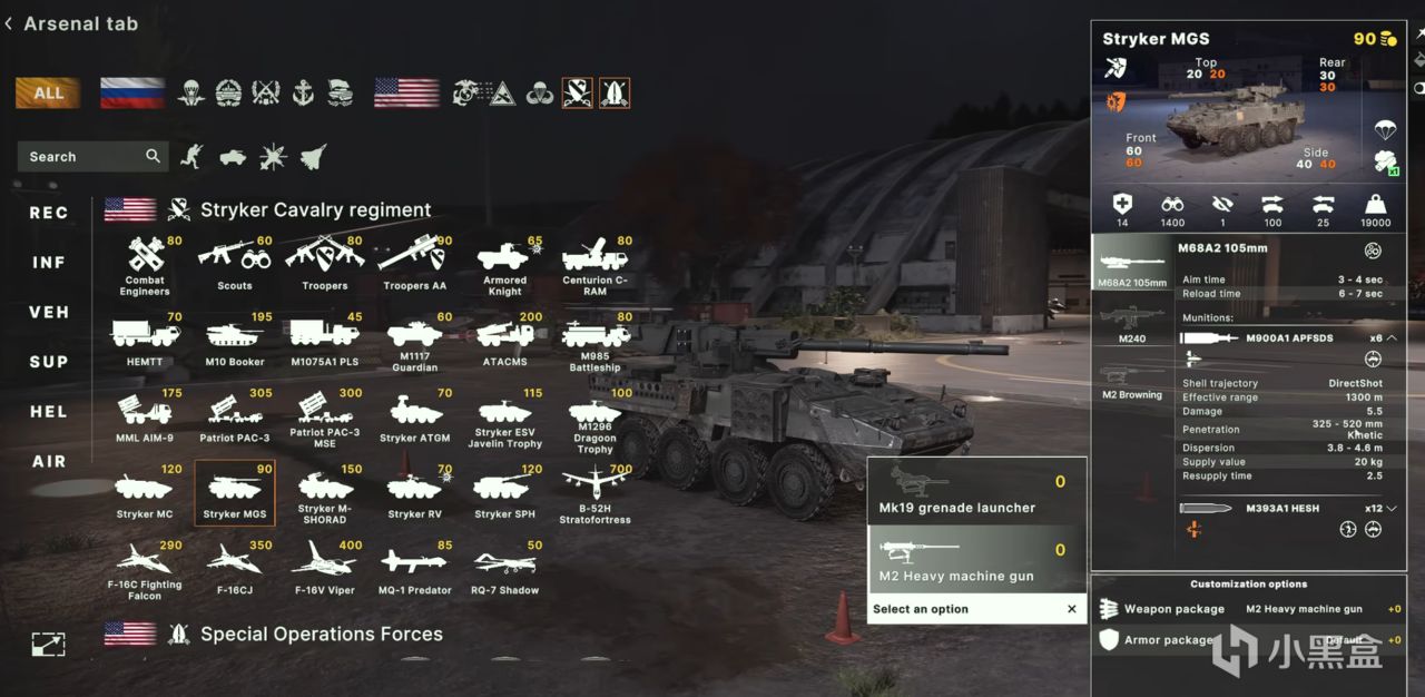 大名鼎鼎的M1128,搭載一門105mm主炮,可發射520穿的鋼針,同時可將默認的機槍更換爲榴彈發射器,可加裝額外裝甲以及“戰利品”主動防禦系統。