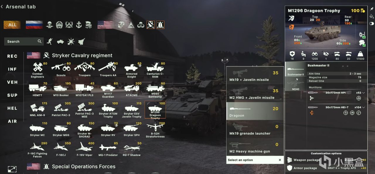 與工程車的武備相似,可額外加裝30mm炮塔的史崔克,可發射150穿的穿甲彈,可加裝額外裝甲以及“戰利品”主動防禦系統。