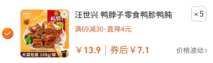整根大鸭脖、鸭翅、鸭掌、魔芋爽、素毛肚等多种可选,甜辣/麻辣/香辣不同口味,组合拍5件,折¥3.51/件。严选新鲜鸭原料,传统工艺慢卤,肉质紧实,嚼劲十足,独立包装,开袋即食。