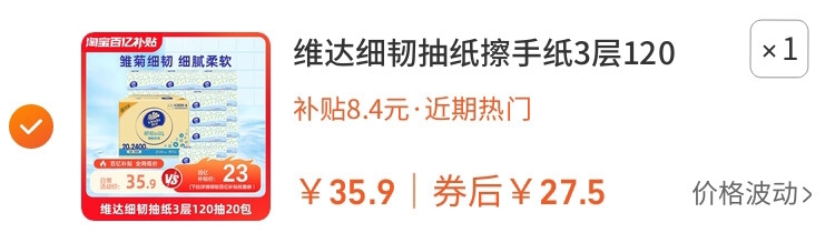 下拉详情页领4.5元惊喜红包,跳转拍下就是,平均¥1.13/包。优质原生木浆材质,柔韧度更好,三层加厚,擦拭不掉絮,不含荧光剂增白剂,纯净无香型,安全无刺激,母婴可用。