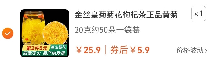 拍第一个选项,大概到手50朵。高山直采,经过人工细选,朵朵饱满均匀,金黄亮丽。茶汤清澈透亮,浓郁菊香,有助锁住茶香,清肝明目,清热降火,美颜抗疲劳等功效。