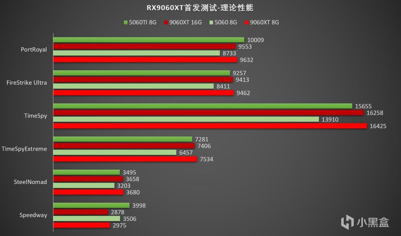 先来看看理论性能,非常有意思的是理论跑分上8GB版本的9060XT还略高于16GB版本一点,主要是因为8GB的显存功耗略低,从而给核心更多功耗,对显存要求不高的跑分场合上核心性能越强越占便宜。