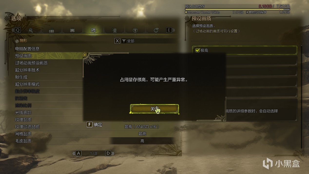 在游戏中把画质改为“极高”的时候,三张8G显卡都会弹出显存不足的提示: