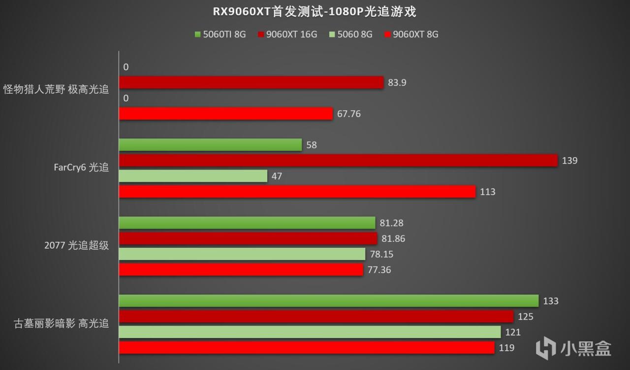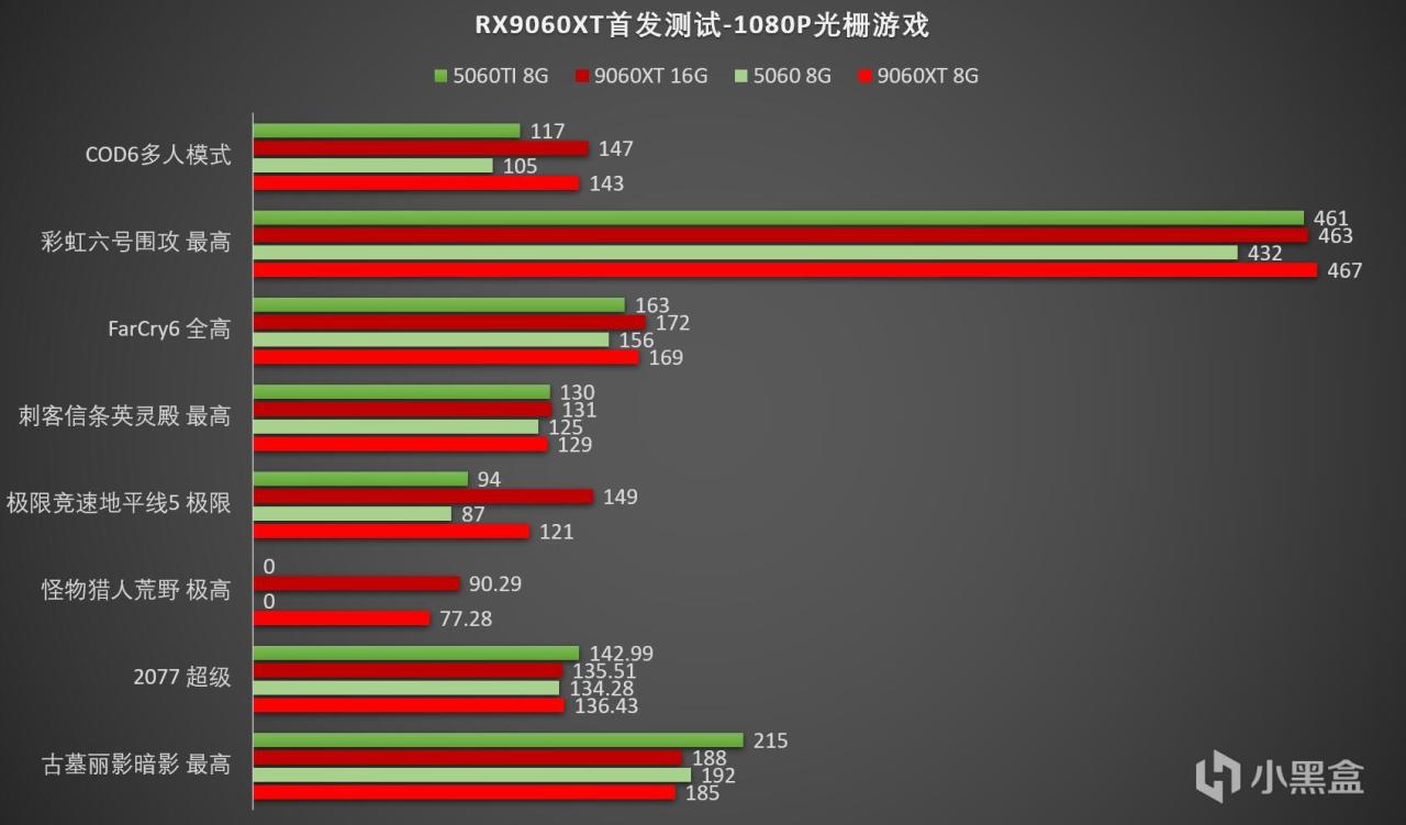 而1080P光栅游戏下,去掉怪物猎人这俩零蛋,9060XT 8GB版本游戏性能领先RTX5060 8G大约10%,9060XT 16GB版本游戏性能领先RTX5060TI 8GB版本也是10%左右,个别主机移植游戏甚至高达50%的差距——随着3A游戏越来越不重视PC平台而在主机上蓬勃发展,A卡与主机同架构的优势将会越来越大。同时也可以看到,在如今这个年代,8G显存在1080P分辨率下都有点不够用了,大显存即使是在1080P分辨率下也是有性能优势的。