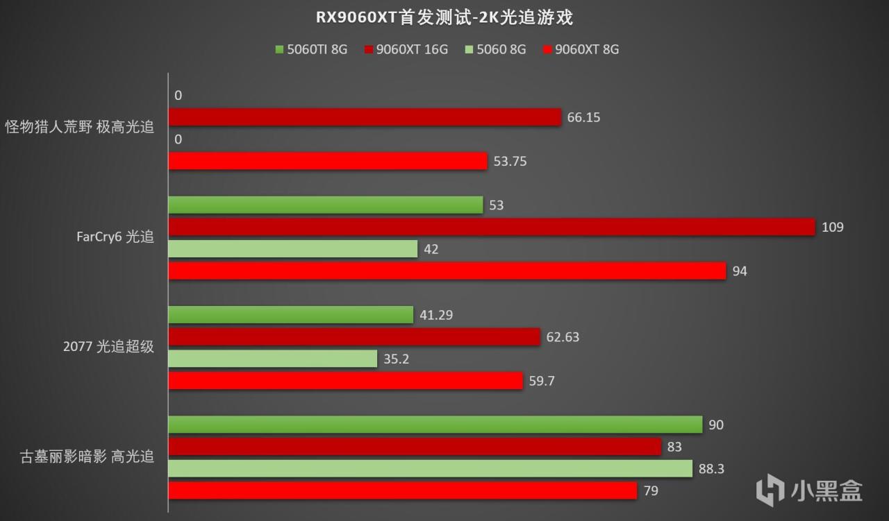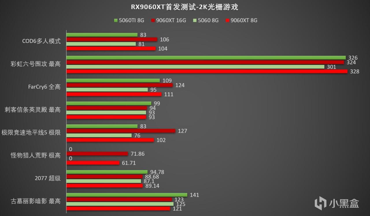 到了2K游戏下,情况基本没有变化,9060XT依然维持着对竞品10%左右的性能优势,在吃显存的俩游戏FarCry6和地平线5中,差距还略微扩大了一点。