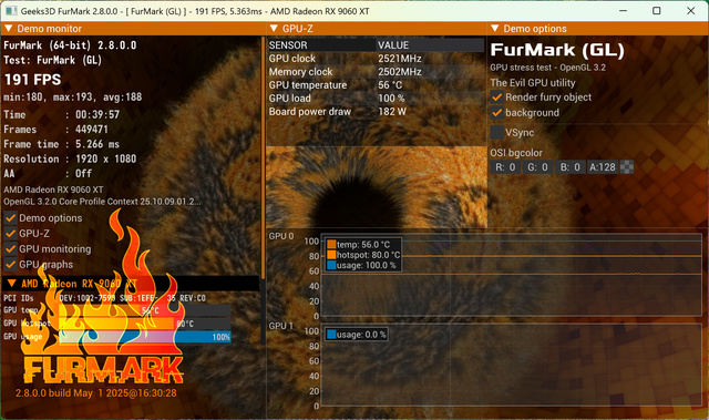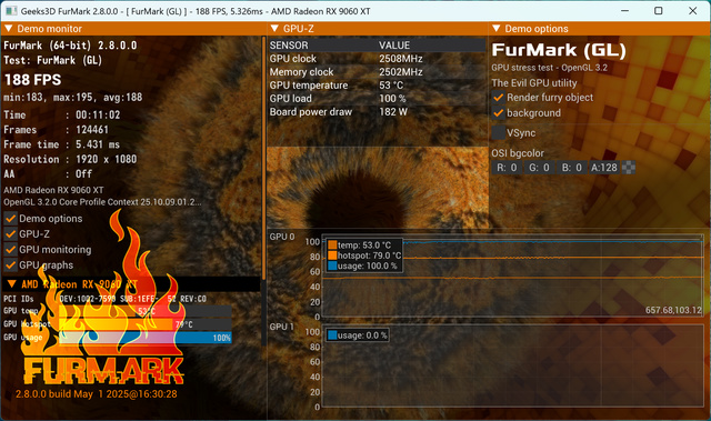▲ 翰铠 Radeon RX 9060 XT 8GB 黑色合金在 Furmark 2.8.0.0 1080p 满载实测可以看到,两张卡在功耗上并没有什么本质区别,都是 182W 的满载功率。