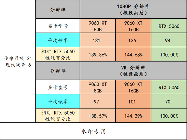 ▲ 三张显卡的 《使命召唤 21 现代战争 6》benchmark 性能实测,以 RTX 5060 为对照组。
