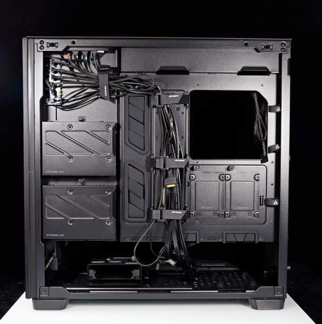 ▲ 机箱的背部拥有十分出色的理线系统。此外机箱还有 3 3.5 英寸 HDD 硬盘架 以及 3 2.5 英寸硬盘架,方便用户做出扩展安装。机箱支持传统安装电源方式与创新的 iShift 电源 90°安装方式。90° 转置安装方式能够让电源走线更加便捷、散热风道更加顺畅。