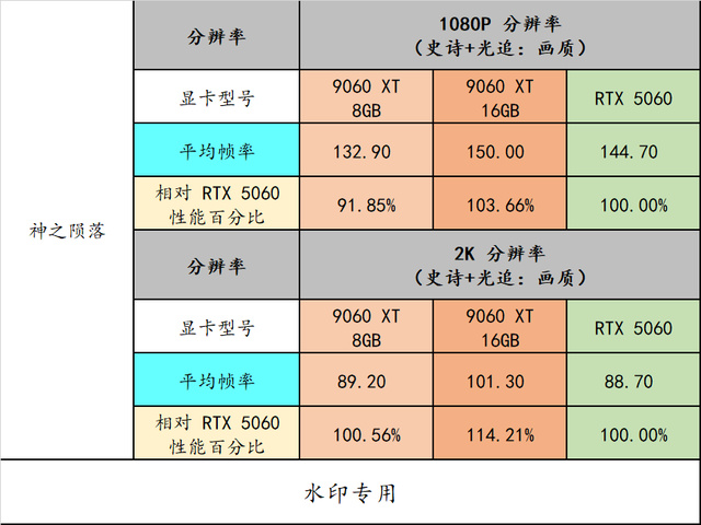 ▲ 三张显卡的 《神之陨落》游戏性能实测,以 RTX 5060 为对照组。