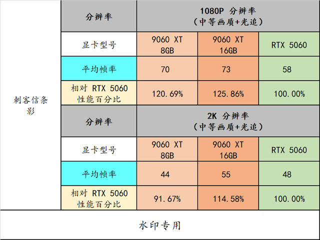 RX 9060 XT 8GB 比 RTX 5060 ,在 1080P 分辨率 + 全高画质 + 光追下落后 9 %,在 2K 分辨率 + 极高画质 + 光追下 强 2 % 。