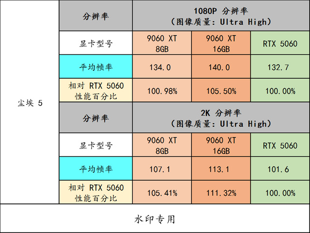 ▲ 三张显卡的 《尘埃 5》游戏性能实测,以 RTX 5060 为对照组。