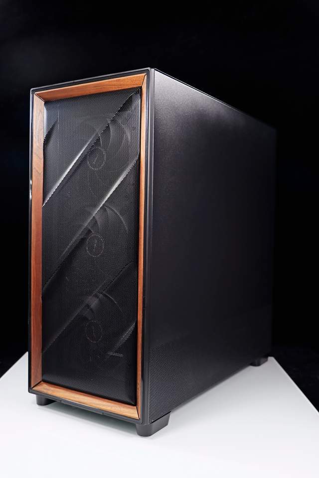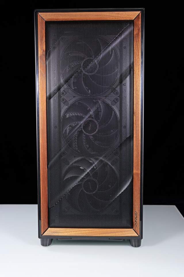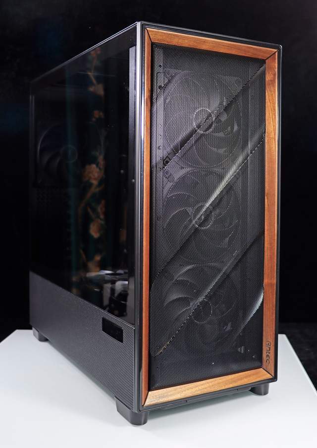 ▲ 机箱采用安钛克 FLUX PRO 这一款独特的胡桃木外观钢化玻璃侧透机箱。这款机箱拥有极为出色的散热风道,机箱标配 6 把 PWM 散热风扇,搭配上水冷散热器或者其他散热风扇,可以实现立体的散热效果。