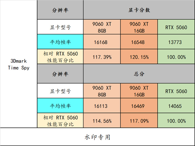 ▲ 3 张显卡的 3Dmark Time Spy 性能测试,数据汇总而成表格,以 RTX 5060 为对照组。