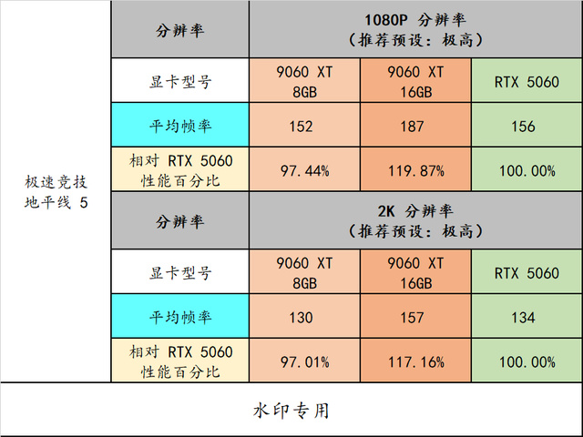 RX 9060 XT 8GB 比 RTX 5060 ,在 1080P 分辨率 + 推荐预设:极高 略输 3%,在 2K 分辨率 + 推荐预设:极高下略输 3%。