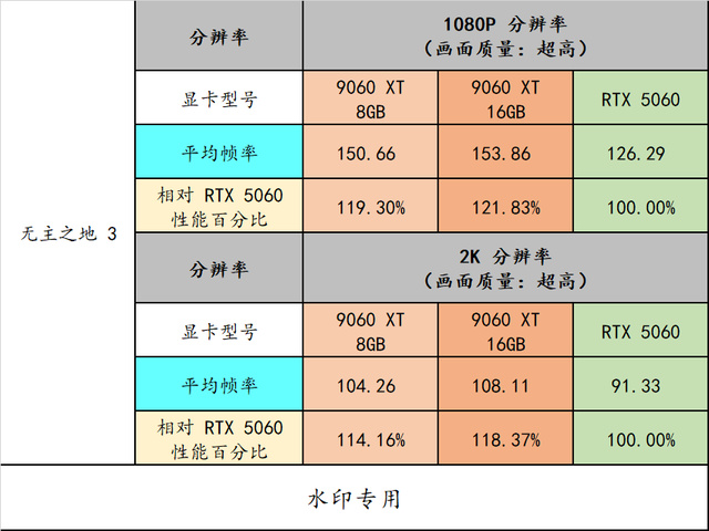 RX 9060 XT 16GB 比 RTX 5060, 在 1080P 分辨率 + 最好画质下 落后 2 %,在 2K 分辨率 + 最好画质下 落后 3 % 。