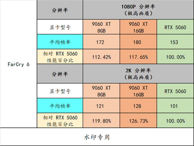 ▲ 三张显卡的 《FarCry 6》游戏性能实测,以 RTX 5060 为对照组。
