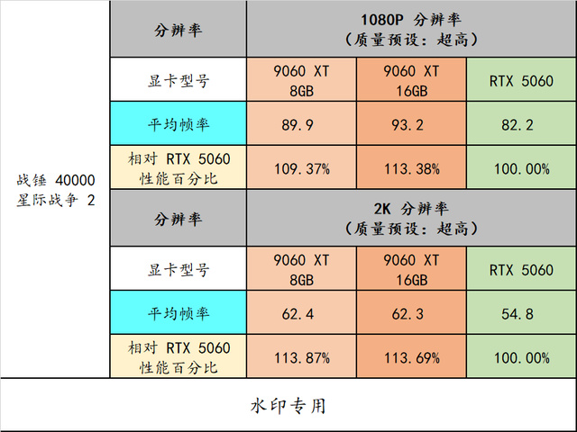 通过实测可以看到 9060 XT 在性能充分发挥的情况下,比 RTX 5060 在 《战锤 40K 星际战争 2》强 13% 左右。