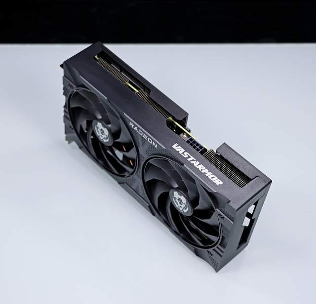 ▲ 显卡尾端也一模一样。从图中可以看到,显卡的导流罩对显卡进行了全包裹,可以有效将散热风扇的出风引导到散热塔体上,从而让散热更高效。