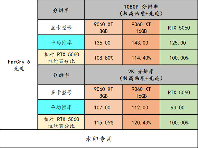RX 9060 XT 8GB 比 RTX 5060 ,在 1080P 分辨率 + 全高画质 + 光追 下落后 6 %,在 2K 分辨率 + 极高画质 + 光追下 落后 6 % 。