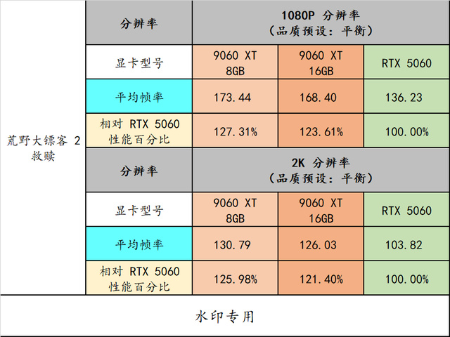 RX 9060 XT 8GB 理论性能比 RTX 5060 ,在 1080P 分辨率 + 品质预设:平衡下 强 27 %,在 2K 分辨率 + 品质预设:平衡下 强 25 % 。