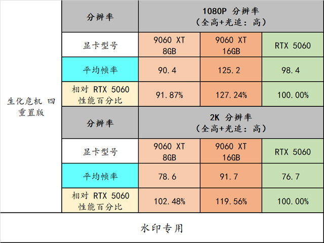 RX 9060 XT 16GB 比 RTX 5060, 在 1080P 分辨率 + 全高画质 + 光追下 落后 1 % ,在 2K 分辨率 + 极高画质 + 光追下 落后 1 % 。