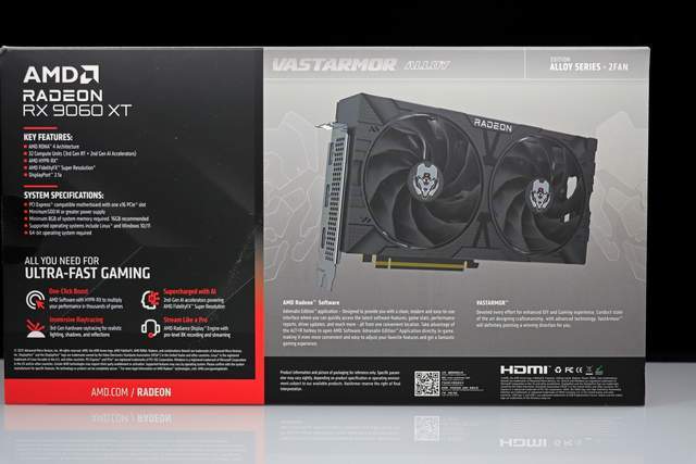 ▲ 像我这次拿到手的翰铠 RX 9060 XT 黑色合金 8GB / 16GB 双版本在外观、其他参数上并没有明显的差别,唯一的差别就是显存容量。