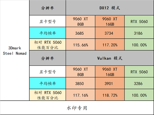 ▲ 3 张显卡的 3Dmark Steel Nomad 系列性能测试,分别为 DX12 模式,以及 Vulkan 模式,分别记录总成绩后,汇总表格,以 RTX 5060 为对照组。
