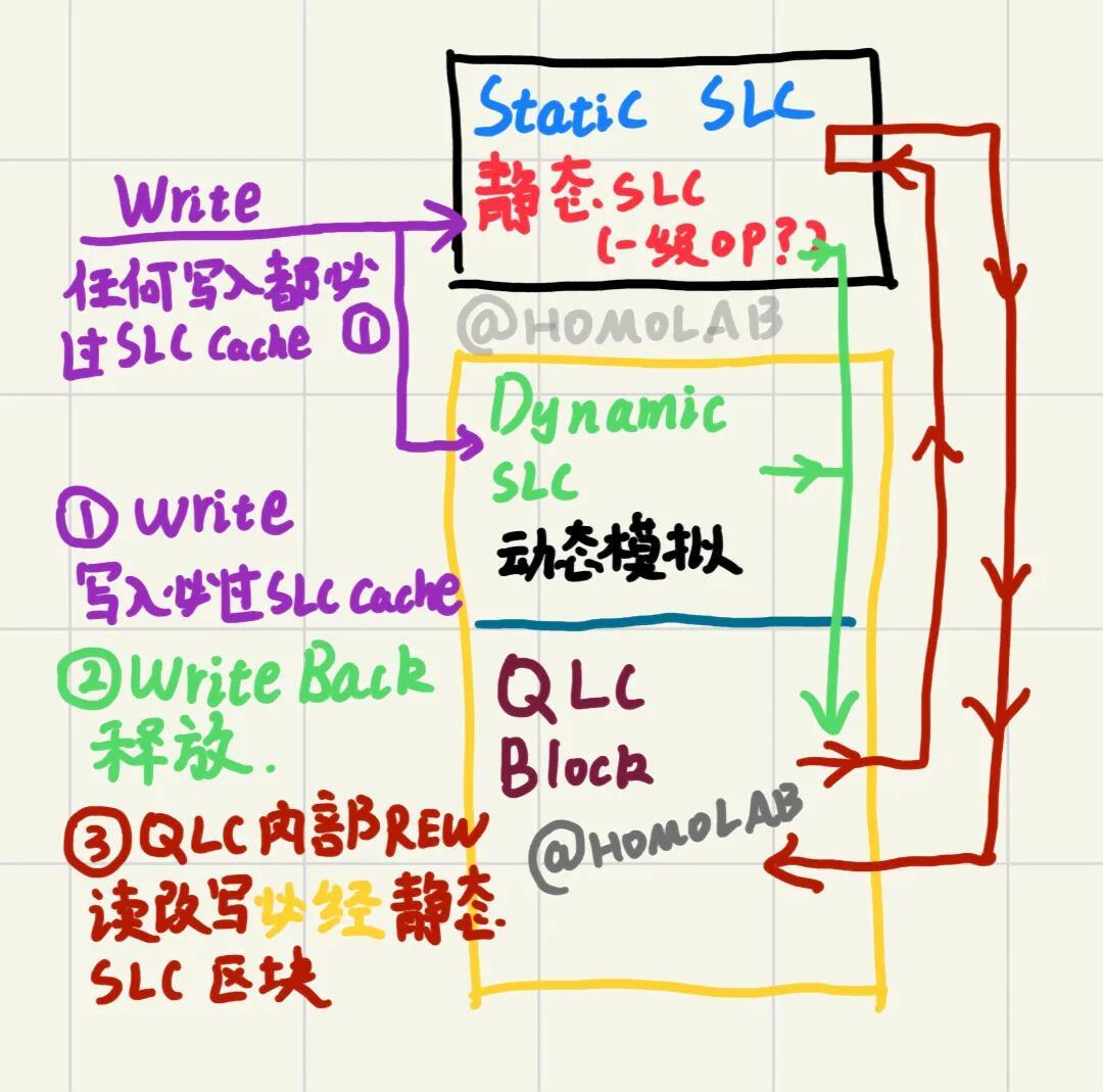 根据HOMOLAB的分析,nCache 4.0方案的策略是,SSD在持续进行数据写入时,即便SLC Cache耗尽,也必须先向SLC Cache写入,随后数据才能被释放并写入TLC区块。