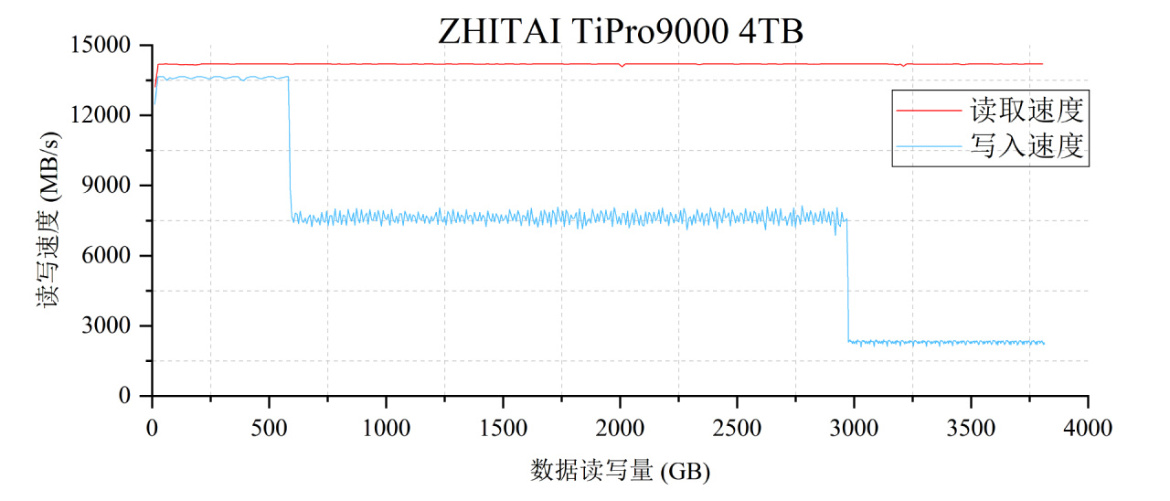 举例来说,4TB版的TiPro9000,只凭NAND颗粒本身的素质,就可以实现SLC缓外接近8000 MB/s的直写速度,而这已经超过很多PCIe 4.0固态硬盘的缓内写入速度。