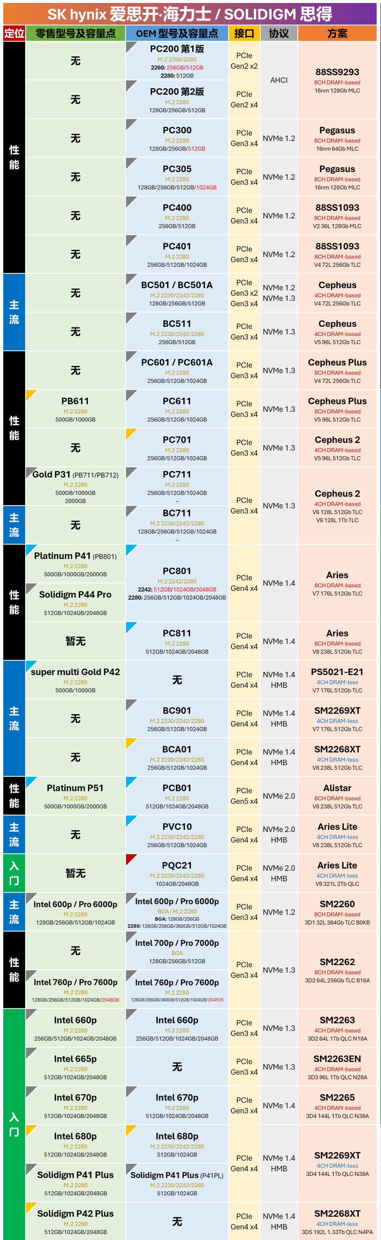 看过我之前几次转载的朋友们想必都知道,这张表格信息量极大,几乎将几家主流存储大厂的M.2 SSD的型号全部收录了,在其中不仅能查询到零售与OEM版型号之间的对应关系,而且还能查找各型号的主控、NAND等硬件方案信息,可谓是SSD爱好者必备的工具之一。