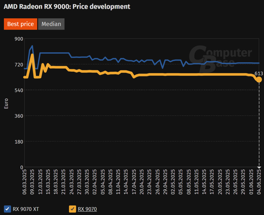 根據ComputerBase提供的比價工具數據顯示,RX 9070一度在德國的一家零售平臺以613歐元(5032元)價格出售,而官方建議售價爲629歐元,合人民幣5164元。