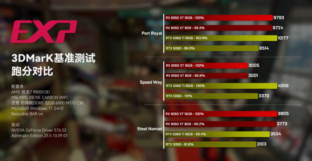 按照AMD公佈的圖表,在1080P全最高設置下,RX 9060XT 8GB比RX 7600綜合優勢爲55%,而在1440P全高設置下,RX 9060XT 16GB比RX 7600XT強46%。
