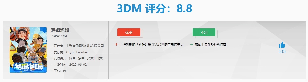 从综合反馈来看,媒体对《泡姆泡姆》的游戏机制、画面表现以及可玩性等方面给予了较高的评价,这些评分不仅反映了游戏的品质和特色,也从侧面印证了其在国内市场的受欢迎程度。