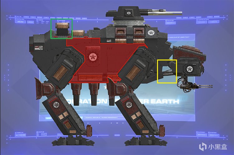 綠色部分:關節連接處,此處無護甲覆蓋,裝甲等級爲4級,但是傷害傳導率低(40%)且移動工廠會走難以攻擊到,使用筒子武器兩發可以擊殺移動工廠(同一區域)或者三個鋁熱劑手榴彈。使用最後通牒射擊它的腳掌也能擊殺。