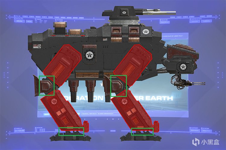 腿部裝甲:腿部裝甲和其他部位裝甲一致,血量爲1500點,擊毀會露出破損部分,雖然血量低,但是腿部的傷害傳導僅爲30%破損後也僅爲40%,攻擊腿部效果不佳。