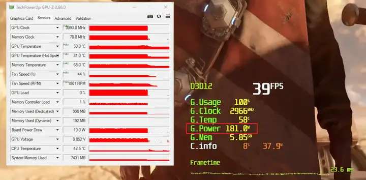 A卡9000系的能耗比做的很不错,已经非常接近N卡的50系。像RX9060XT 16G烤机满载下,功耗大概在180W,温度在60°C左右,热点温度在80°C上下: