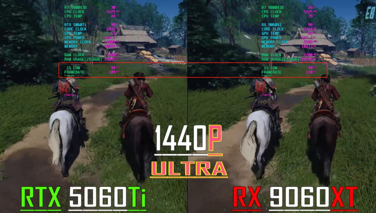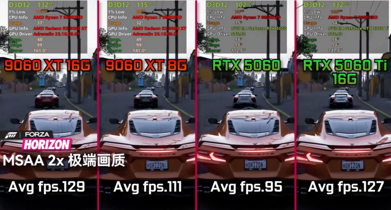 游戏上,9060XT 16G和5060TI 16G打的是有来有回: