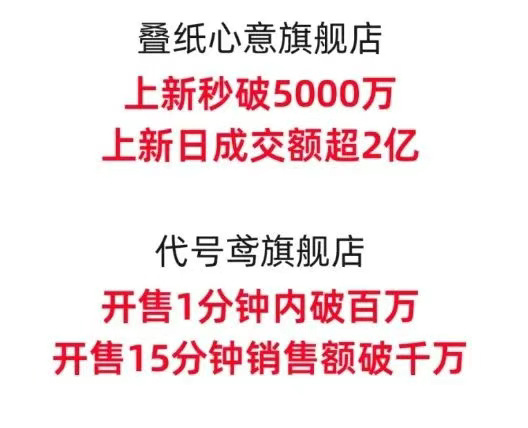 而国乙的新品常常能带起抢购热潮。去年,叠纸心意旗舰店也创造了“上新秒破5000万,上新日成交额超2亿”的成绩,当时另一爆款女性向游戏代号鸢旗舰店,也创造了开售15分钟销售额破千万的成绩。