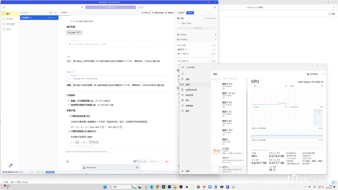 部署设置好deepseek-r1模型后,我们通过LM Studio向deepseek提问,观察到deepseek思考过程中确实使用了AMD Radeon RX 9060 XT显卡,并几乎满载,说明AMD显卡目前确实可以不依靠复杂手动安装就能支持AI本地部署。